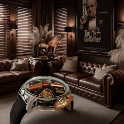 42mm のポリッシュ仕上げグレード5チタン製ケースは、センターに配された特別な石によって、その存在感を高めている。マエストロ・シェイプにカットする複雑さ(80% もの破損リスク)と相まって、この文字盤は真の希少品となっている。マエストロのケースのインスピレーションは、フランチェスコ・ボッロミーニが 17 世紀にローマに建てたバロック様式のモニュメントにある。アシンメトリックなケース、流れるようなベゼル、そして 6 時位置の凸型の「スマイル」は、このファサードから生まれた。オリジナルの GC 39 と同様、マエストロが長方形であるのに対し、このモデルは基本的な正方形を中心にデザインされている。複雑なケースデザインとムーブメントのジャンピングアワー機構にもかかわらず、マエストロ GC39 25周年記念モデルの厚さはわずか 11mm となっている。